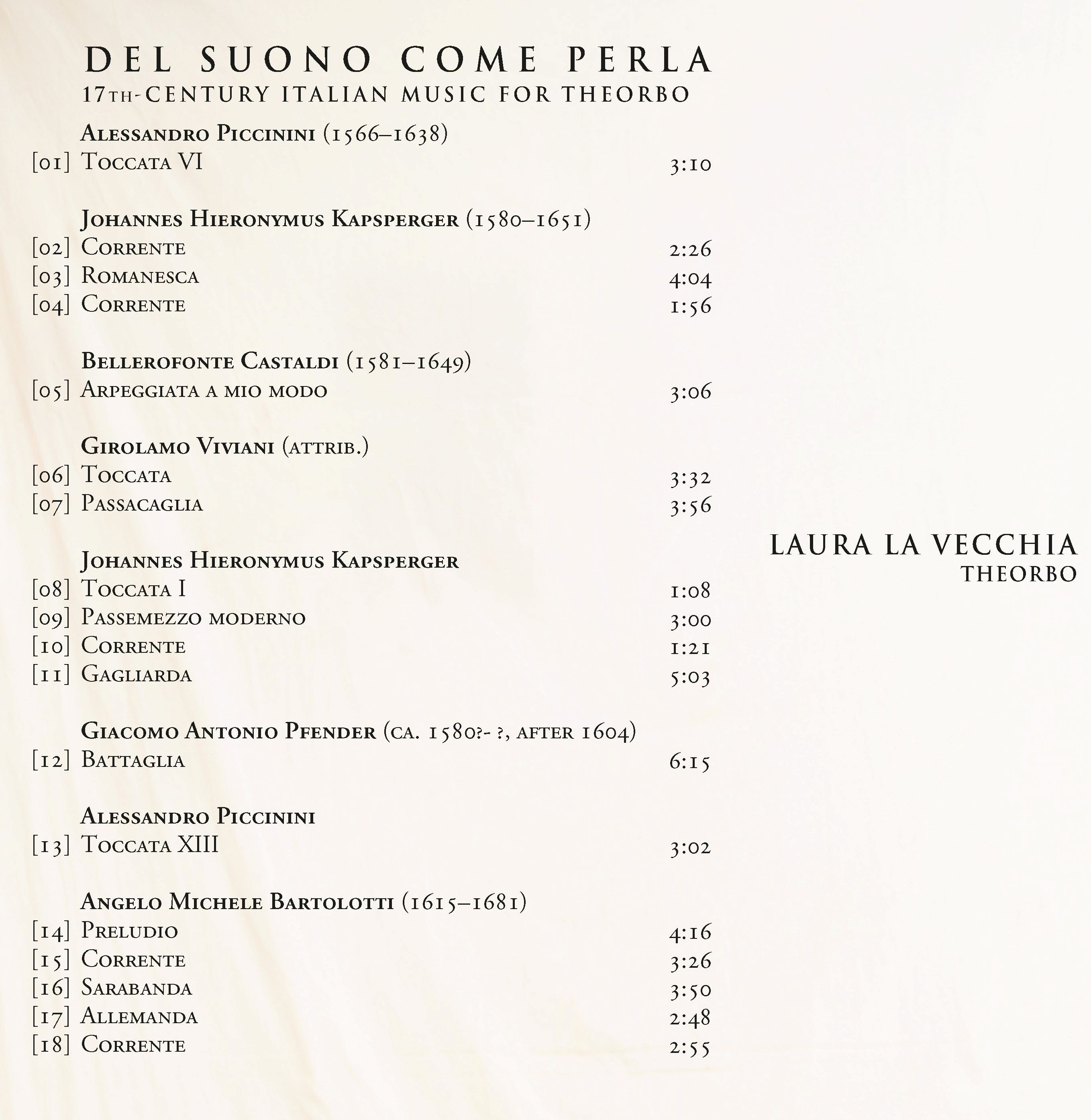 Questo album Da Vinci Classics vede protagonista la tiorbista solista Laura La Vecchia, che ci guida in un affascinante itinerario attraverso alcuni tra i più importanti compositori del Seicento. Tra questi figurano Alessandro Piccinini, Johannes Hieronymus Kapsberger (presente con opere conservate nell’Archivio Albani di Pesaro e a Parigi), Bellerofonte Castaldi, Girolamo Viviani (da un manoscritto di Modena), Giacomo Antonio Pfender (anch’egli dall’Archivio modenese) e Angelo Michele Bartolotti (da un manoscritto viennese). Il tratto che li accomuna è la padronanza del linguaggio contrappuntistico, una lingua comune che essi parlarono e in cui si formarono. Grazie ad essa, poterono dialogare con il mondo melodico del canto, intrecciando linee e costruendo ponti e architetture sonore. Le loro opere, riunite in questo programma, restituiscono all’ascoltatore tutto il fascino di uno strumento maestoso, capace di intensità e dolcezza, lirismo e poesia.