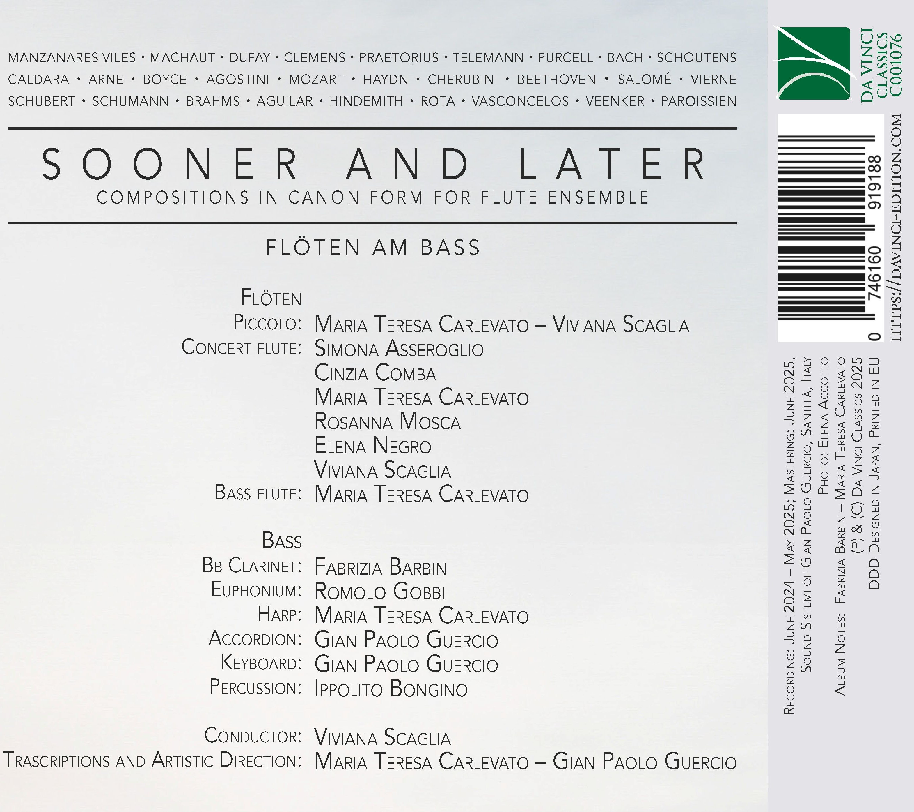 Questo album Da Vinci Classics presenta una successione cronologica di canoni, composti da 27 diversi musicisti. Di particolare interesse sono le composizioni contemporanee di Luis Miguel Aguilar, David Manzanares Viles, Jacques Paroissien, Hans Schoutens, Melquíades Vasconcelos e Rieks Veenker, qui proposte nella versione per coro di flauti con accompagnamento, in prima mondiale per Da Vinci Classics. Si tratta del frutto di una stretta collaborazione tra questi compositori e l’ensemble flautistico Flöten am Bass, con l’obiettivo di ottenere un’interpretazione il più possibile fedele all’idea originaria dell’autore. Per quanto riguarda le restanti tracce, salvo alcune eccezioni costituite da brani presentati nella loro versione originale, l’album propone trascrizioni adattate per Flöten am Bass da Maria Teresa Carlevato e Gian Paolo Guercio. L’opulenta tracklist include opere che spaziano da Machaut a Mozart, Schumann, Brahms e molti altri.