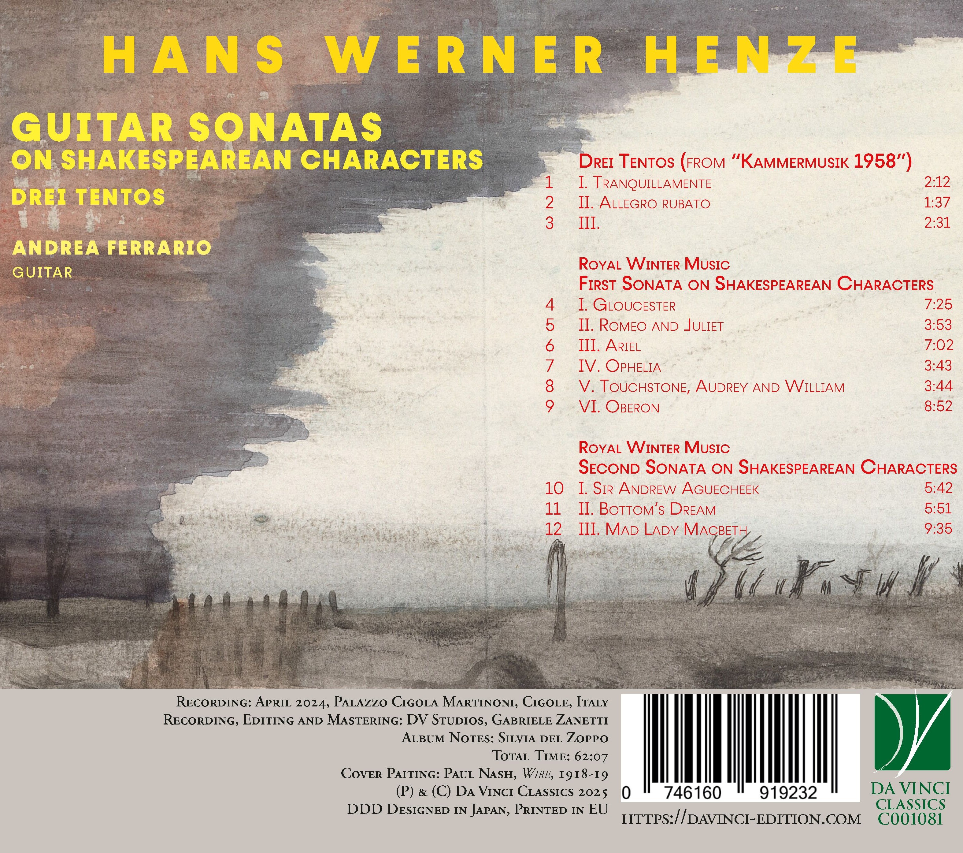 In Royal Winter Music, un totale di nove movimenti rappresenta dodici personaggi tratti da varie opere di Shakespeare. La scelta di un soggetto decisamente inglese è giustificata dalla dedica dell’opera a Julian Bream. Oltre a essere stato il primo chitarrista britannico a raggiungere una fama internazionale, Bream è anche ricordato per aver rilanciato l’interesse verso la musica per liuto rinascimentale. Inoltre, grazie alle traduzioni di August Wilhelm Schlegel, Shakespeare era ormai, almeno dal XIX secolo, parte integrante della letteratura romantica tedesca. Nella prefazione al primo ciclo, Henze spiega che “i personaggi di questo pezzo entrano attraverso il suono della chitarra come se fosse un sipario”. Sono personaggi in azione, non semplici ritratti, e quindi accompagnati da un forte senso drammatico, pur conservando tratti e stati d’animo ben delineati. Il chitarrista Andrea Ferrario dà vita ai personaggi shakespeariani e arricchisce il programma con i Drei tentos, sempre di Henze, tratti da Kammermusik 1958.