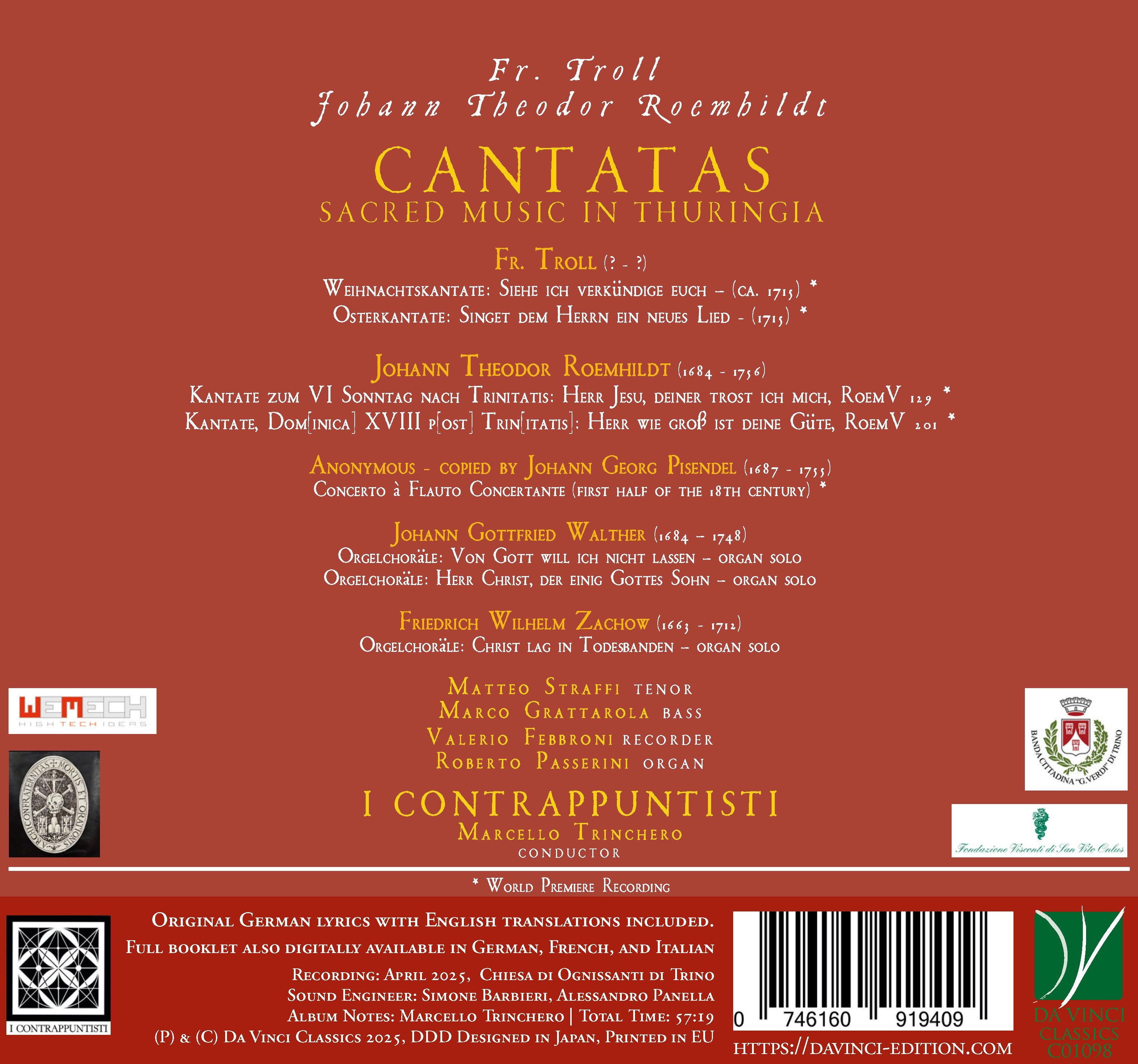 L’album Cantatas: Sacred Music in Thuringia dischiude il paesaggio sonoro della Turingia luterana fra Seicento e Settecento, ricostruito a partire dal celebre ritrovamento del 1968 nella chiesa di Großfahner, dove giaceva celato un corpus di circa trecento cantate. Le pagine sacre di Fr. Troll e Johann Theodor Roemhildt, qui presentate in prima registrazione mondiale, si affiancano al Concerto a flauto concertante tramandato in una copia di Pisendel e ai corali d’organo di Johann Gottfried Walther e Friedrich Wilhelm Zachow, maestro di Händel. In un arco liturgico che va dal Natale alla Pasqua, trombe, timpani, tenore e basso soli, insieme agli strumenti storici de I Contrappuntisti, restituiscono la fisionomia colta e devozionale della musica poetica dell’area bachiana.