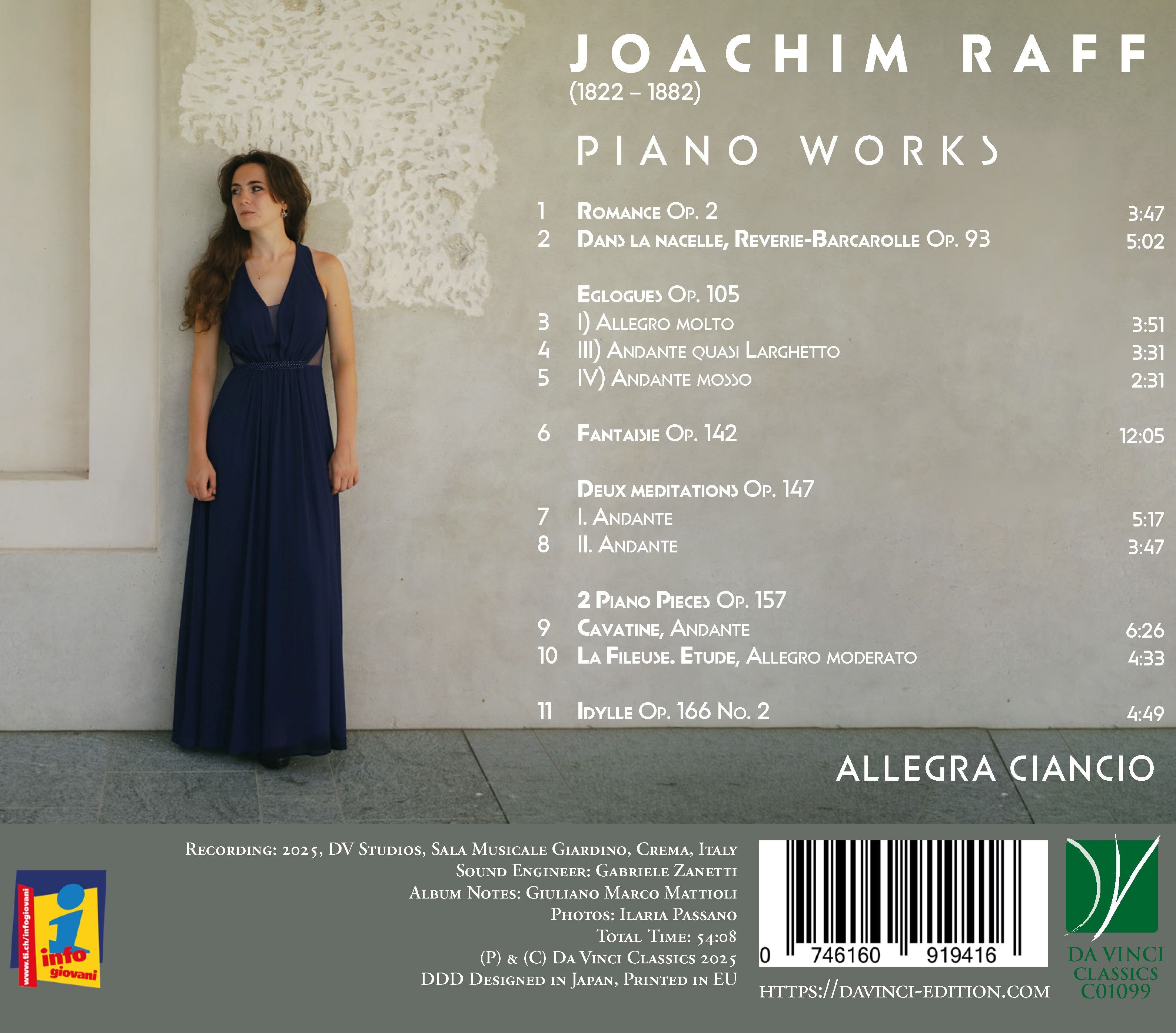 Raff, celebre ai suoi tempi e poi eclissato, riemerge qui come ponte tra classicismo e modernità romantica. La selezione – dalla Romance op. 2 alla rêverie – barcarola Dans la nacelle op. 93, tre Egloghe op. 105, la Fantaisie op. 142, le Deux méditations op. 147, Cavatine e La Fileuse op. 157, fino a Idylle op. 166 n. 2 – disegna un autoritratto poetico: cantabilità tersa, armonie carezzevoli, immaginazione narrativa filtrata da disciplina formale. Allegra Ciancio invita a riascoltare Raff senza pregiudizi e scoprendo un linguaggio che dialoga con Mendelssohn e Liszt, ma custodendo una voce personale, luminosa e discreta, capace di parlare anche a chi si avvicina al repertorio per la prima volta.