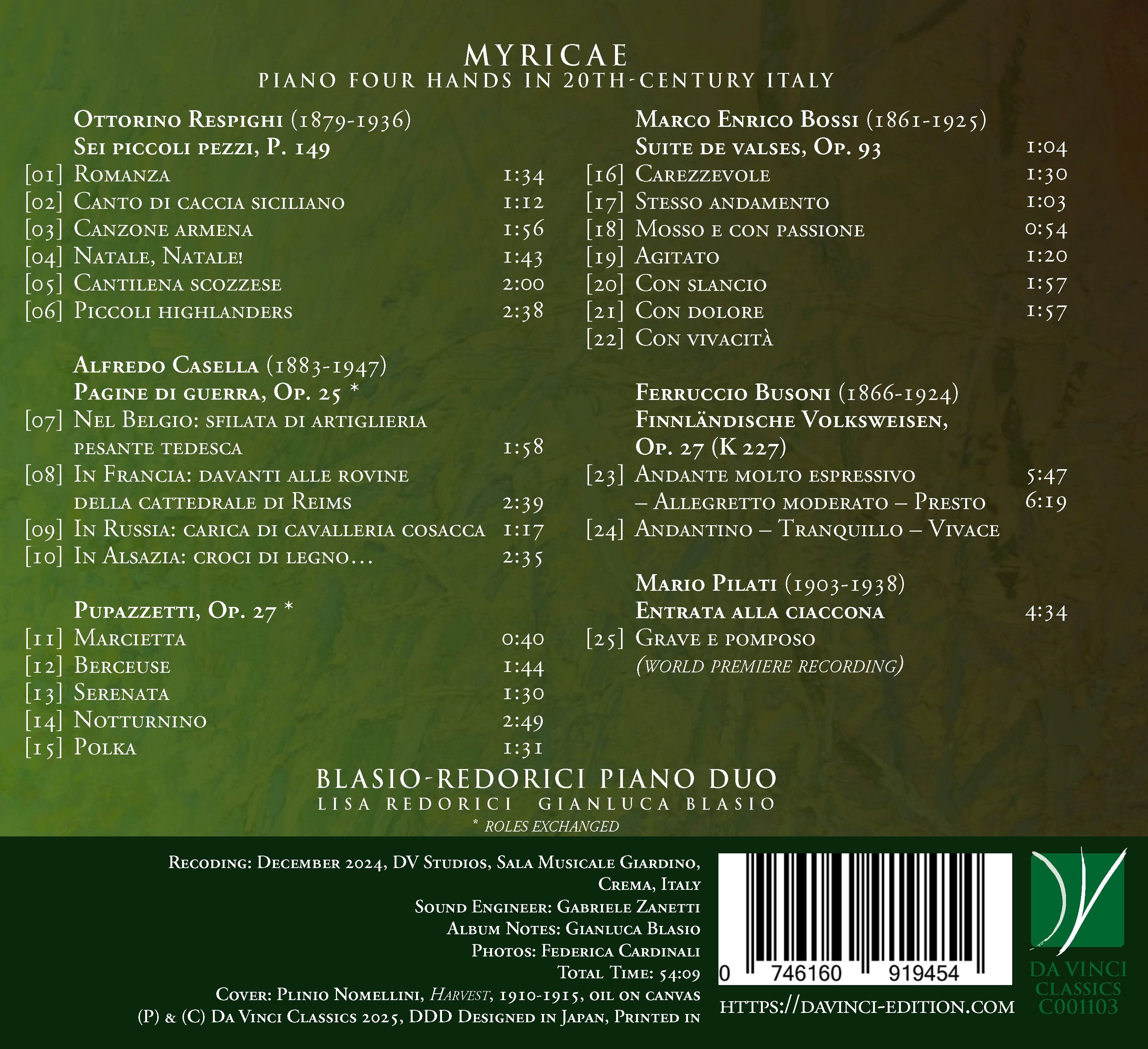 La vivace scena musicale italiana del primo Novecento rivive in “Myricae”, un’antologia per pianoforte a quattro mani che spazia da Respighi a Pilati. Questa raccolta riunisce pagine brevi ma ricche di colori, dai garbati acquerelli sonori di Respighi alle visioni belliche di Casella e ai valzer sognanti di Bossi. Non manca l’estro cosmopolita di Busoni, né la riscoperta di un inedito di Pilati presentato qui in prima registrazione mondiale. Il duo pianistico Blasio-Redorici (Lisa Redorici e Gianluca Blasio) intreccia con eleganza le quattro mani, riportando alla luce un capitolo affascinante del repertorio italiano, sospeso tra tradizione tardo-romantica e slancio modernista.