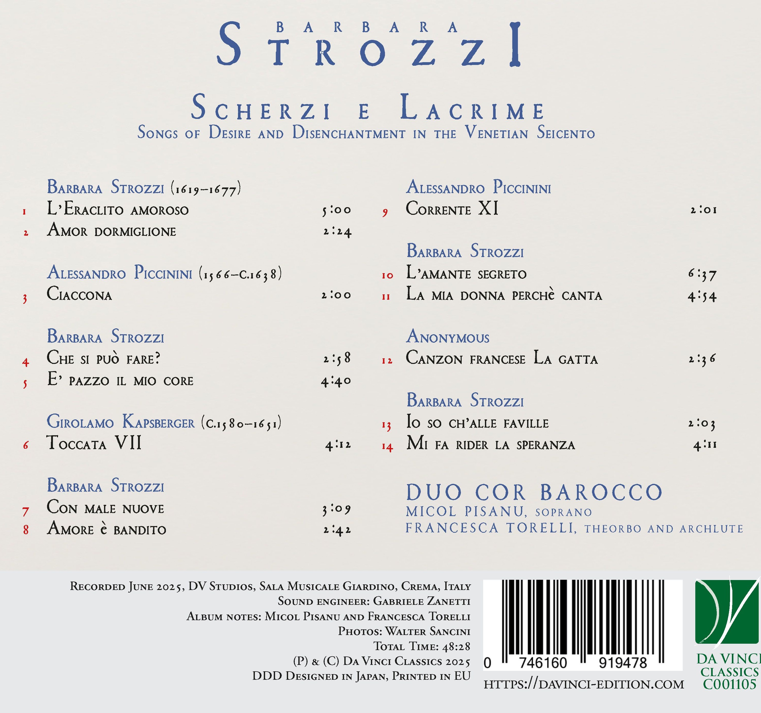 La Venezia del Seicento accoglie Barbara Strozzi, figura straordinaria di compositrice, cantante e poetessa oggi finalmente riscoperta. L’album “Scherzi e Lacrime” ne tratteggia il ritratto musicale attraverso arie e cantate profane – i generi da lei prediletti – rivelando un tesoro di passione, introspezione e virtuosismo espressivo, grazie all’interpretazione del Duo Cor Barocco (la soprano Micol Pisanu e la tiorbista Francesca Torelli). Le cantate di Strozzi danno voce alle sfumature più sottili dell’animo umano, narrando l’amore in molteplici forme: dai lamenti accorati alle schermaglie giocose, con melodie che fondono bellezza e raffinata arte barocca.