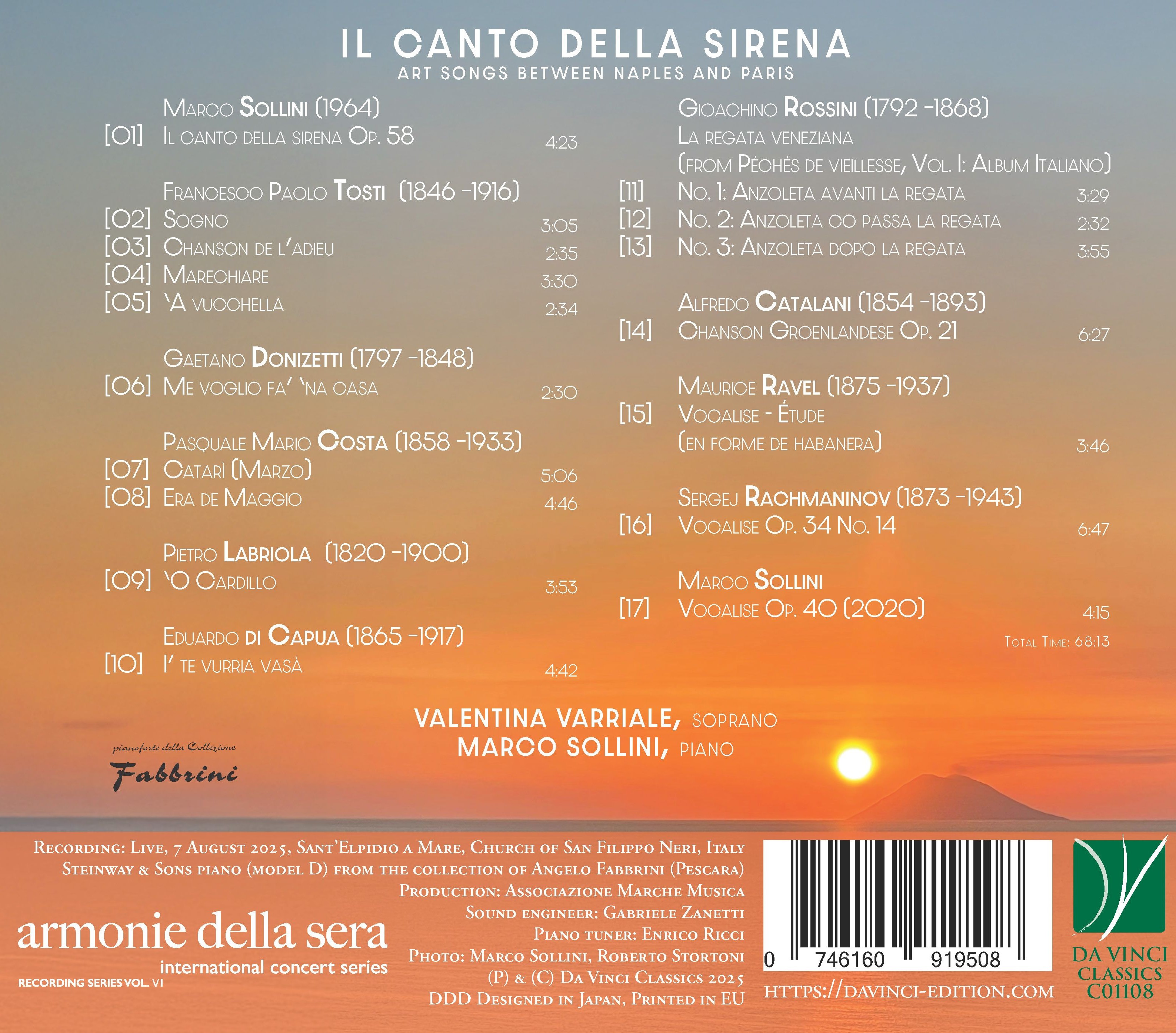 “Il canto della sirena” prende spunto dal mito del richiamo ammaliatore per celebrare il fascino eterno della voce umana. Il programma abbraccia la tradizione vocale tra Napoli e Parigi, accostando appassionate romanze napoletane di Tosti, di Capua e altri a raffinate mélodies francesi di Rossini e Ravel, fino ai celebri Vocalises di Ravel e Rachmaninov. Il pianista e compositore Marco Sollini contribuisce con brani originali, tra cui uno dedicato alla soprano Valentina Varriale. Con brani in dialetto napoletano, in italiano, in francese e fino alle melodie vocalizzate senza parole, l’album mette in luce la versatilità espressiva della voce.