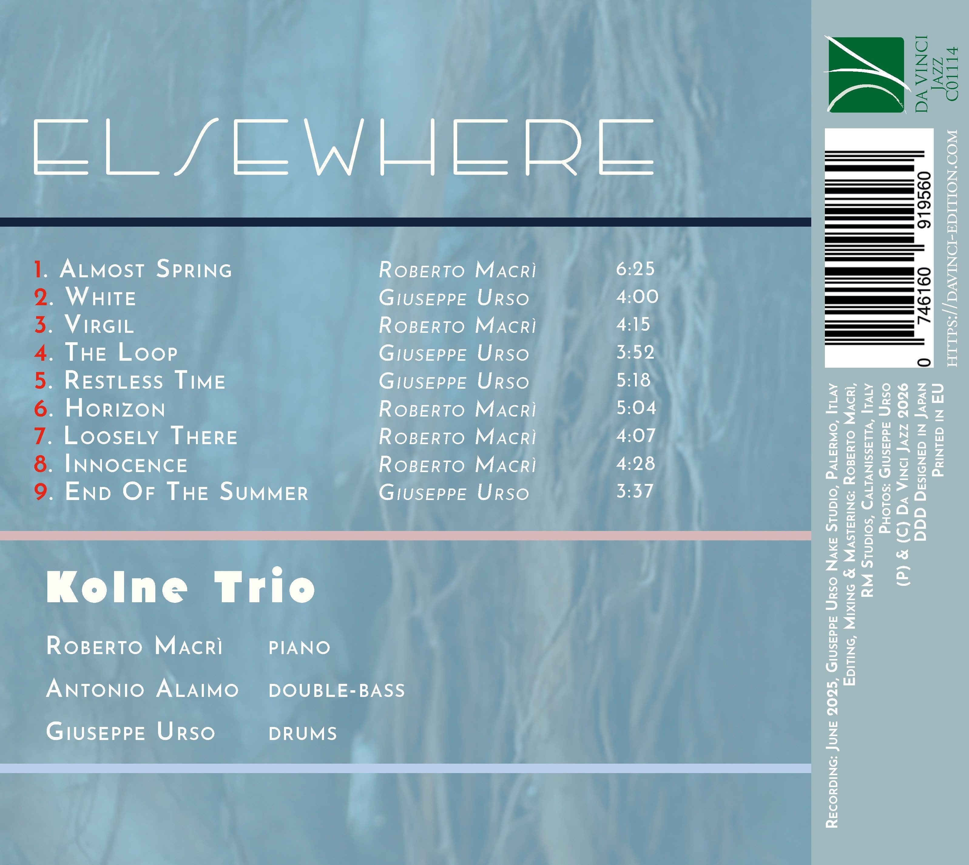 L’album Elsewhere del Kolne Trio si inscrive in una terra di mezzo in cui il jazz contemporaneo incontra la scrittura eurocolta e la più sottile ricerca timbrica, fondendo le nove composizioni originali in un ciclo coerente, quasi una suite speculativa sul tempo sonoro. Trame ritmiche sospese, slittamenti metrici e armonie cesellate aprono uno spazio rarefatto, in cui l’organico classico di pianoforte, contrabbasso e batteria è concepito come laboratorio di forma e di colore più che come semplice dispositivo idiomatico. La solida matrice classica degli autori riaffiora in filigrana e si trasfigura in un palinsesto di rimandi, echi e risonanze, capace di restituire una visione lucida, meditata e pienamente attuale del linguaggio jazzistico.