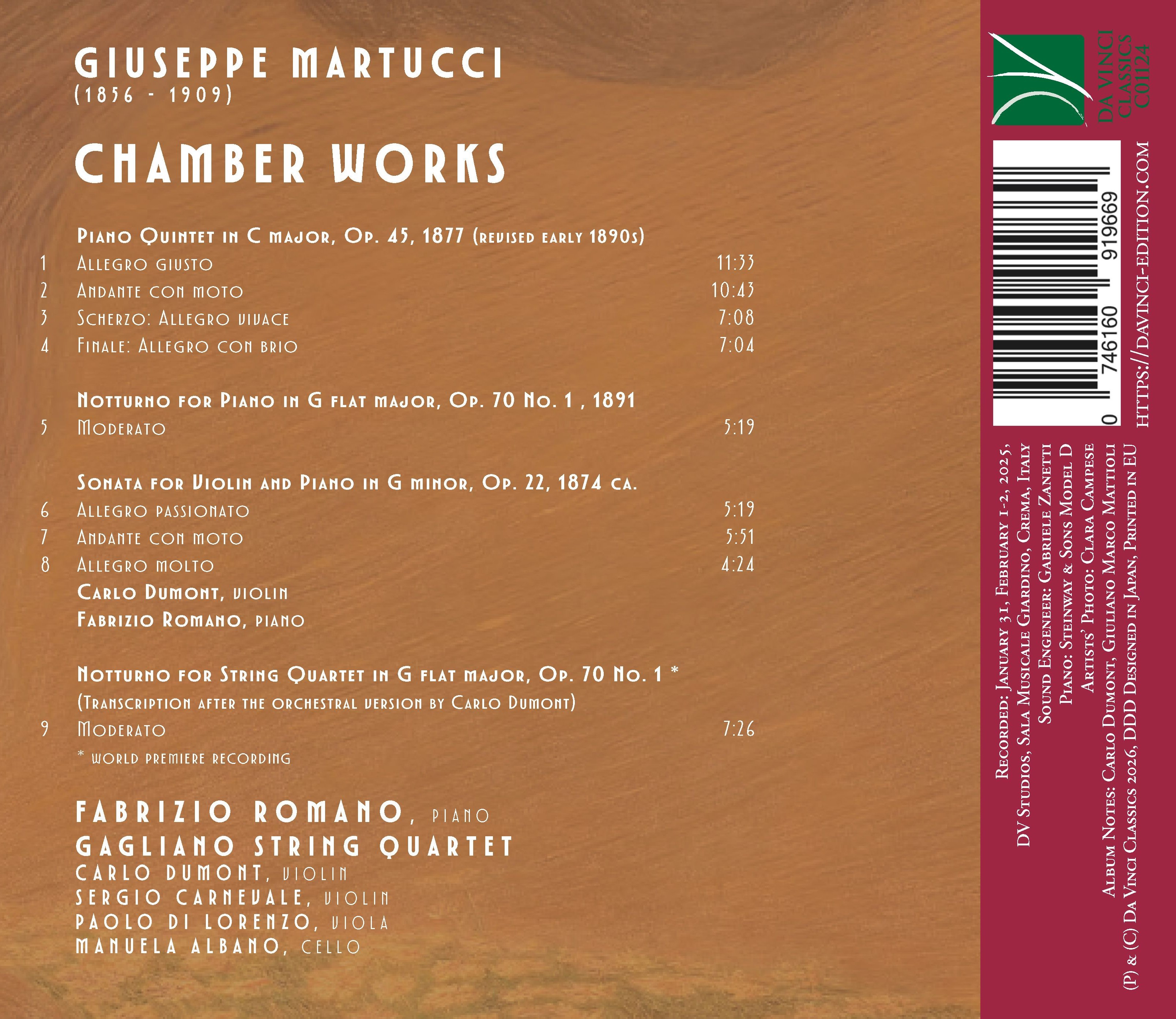 L’album Chamber Works consegna un profilo cameristico a tutto tondo di Giuseppe Martucci, dispiegando un arco che dalla giovanile Sonata per violino e pianoforte in Sol minore op. 22 conduce al maturo Notturno in Sol bemolle maggiore op. 70 no. 1, con il monumentale Quintetto per pianoforte in Do maggiore op. 45 come fulcro drammaturgico. Nella Sonata il giovane Martucci metabolizza Schumann e Saint-Saëns entro una linea flessibile e chiaroscurata, profondamente italiana; nel Quintetto un ideale brahmsiano di trasparenza strutturale si innerva di un canto mediterraneo luminoso. Il Notturno, presentato sia nella versione pianistica sia, qui in prima incisione mondiale, nella trascrizione per quartetto d’archi di Carlo Dumont dalla partitura orchestrale, distilla la vena crepuscolare del compositore in un lirismo argenteo, come abbozzo ideale del quartetto che egli non giunse mai a scrivere.