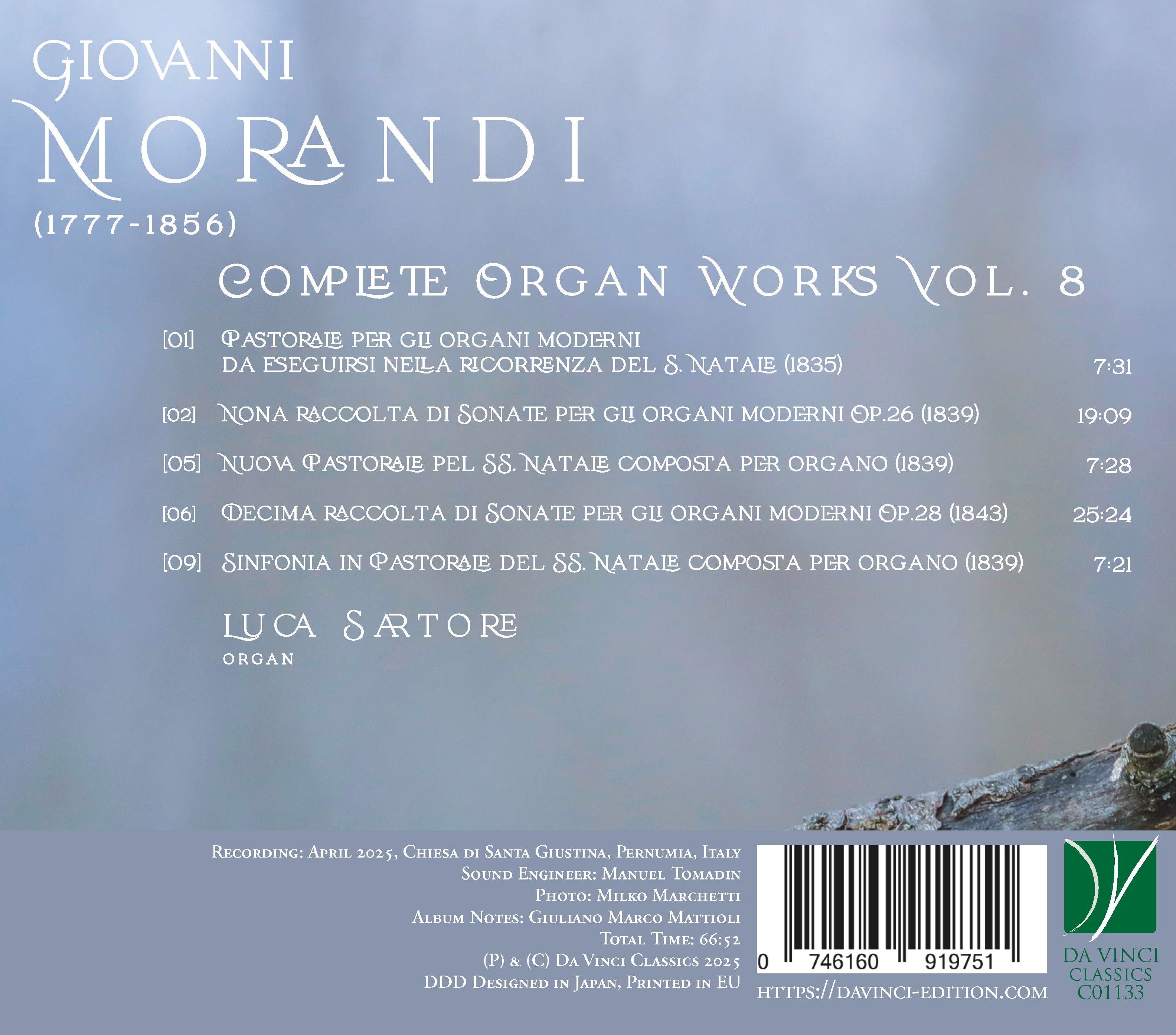 Il vol. 8 delle Complete Organ Works di Giovanni Morandi illumina l’organo italiano del primo Ottocento, in equilibrio fra ufficio liturgico, gusto teatrale e rinnovamento organologico. Concepite per organi moderni, queste pagine dispiegano una tavolozza timbrica ampliata e una spazialità quasi orchestrale, tuttavia governate dalla forma della Messa. Offertorio, Elevazione e Postcommunio, nelle raccolte op. 26 e op. 28, agiscono come architravi spirituali e formali: il teatro non vi irrompe, ma viene ricondotto a misura del rito. Accanto ai dittici natalizi Pastorale e Nuova Pastorale, la Sinfonia in Pastorale concentra l’immagine dell’Incarnazione in una luce diffusa. Eco, Principali, flauti e Voce Umana divengono retorica sonora: devozione che si fa forma.