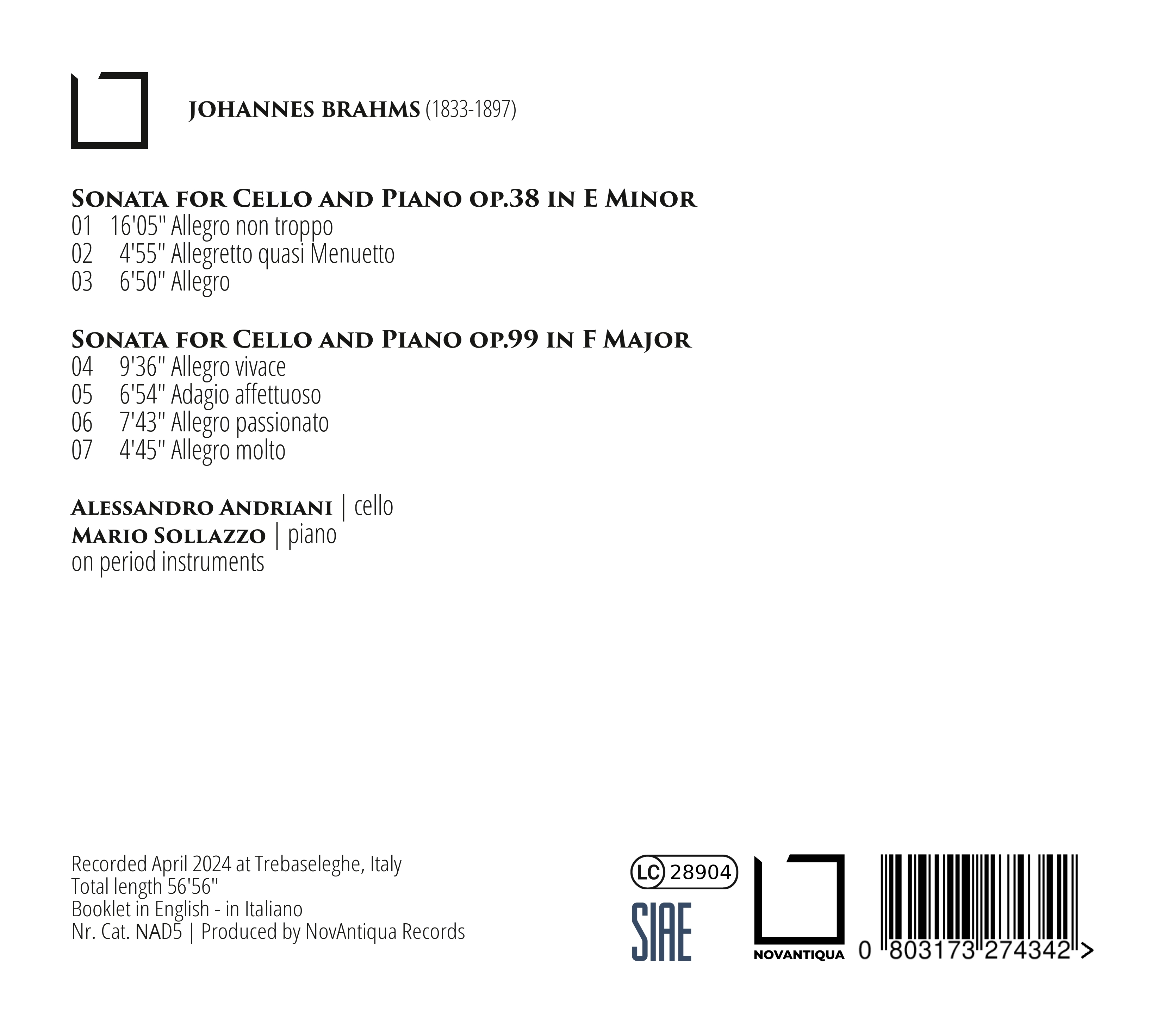 Alessandro Andriani (Violoncello) e Mario Sollazzo (Pianoforte) esplorano da sempre il repertorio dal barocco a tutto il XIX secolo su strumenti originali. Dopo la sorprendente registrazione dell’integrale delle sonate di Beethoven per violoncello e fortepiano eseguite usando due differenti fortepiani originali della collezione di Ugo Casiglia, i due musicisti presentano la loro lettura delle sonate di Johannes Brahms. Questa volta il violoncello Gagliano di Andriani è affiancato da due pianoforti a coda Erard costruiti negli anni di composizione delle due sonate brahmsiane. Il risultato è una ricchezza sonora e timbrica senza precedenti, una libertà di fraseggio, dinamica e ritmica estrema ed una caratterizzazione sonora delle due sonate, composte a decenni di distanza, difficilmente udibile con strumenti moderni.