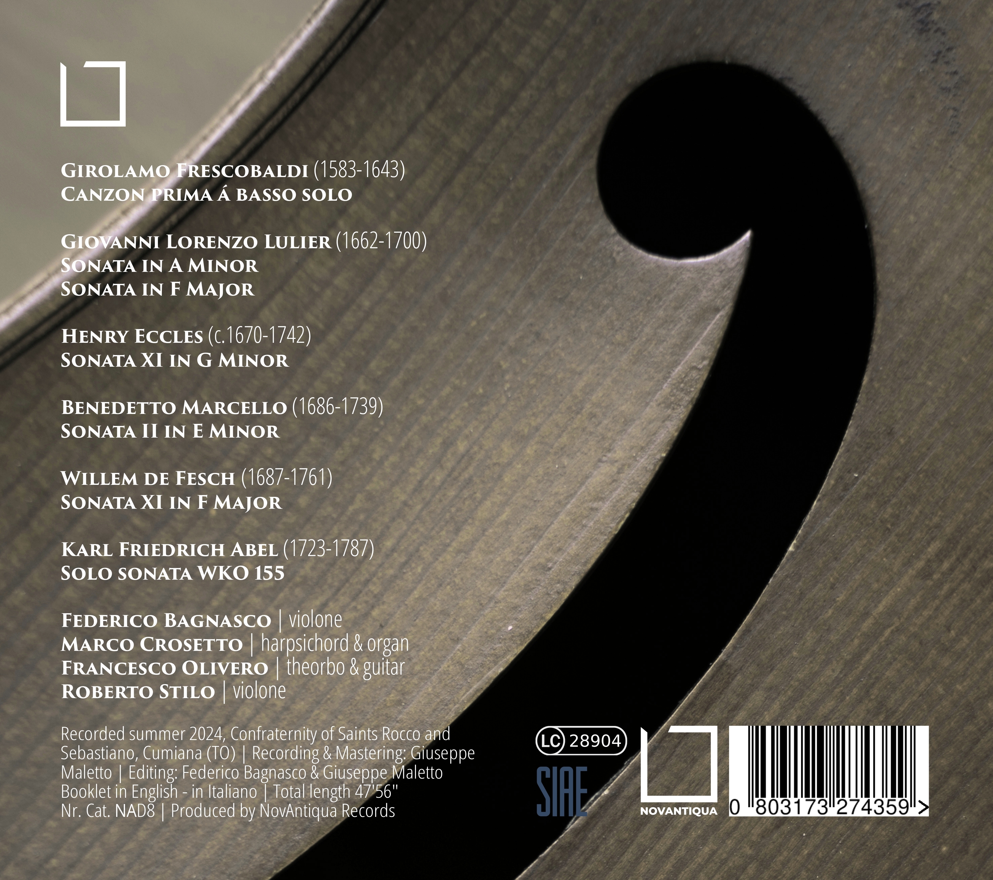 Al violone solista si affiancano strumenti a tastiera o a pizzico per la realizzazione del continuo, e occasionalmente un secondo violone. Per la sonata di De Fesch i due violoncelli sono stati sostituiti con due violoni, di cui il secondo, a quattro corde, è accordato per quinte, un’accordatura storica nell’Europa settecentesca, che consente la possibilità di raggiungere il Do grave.