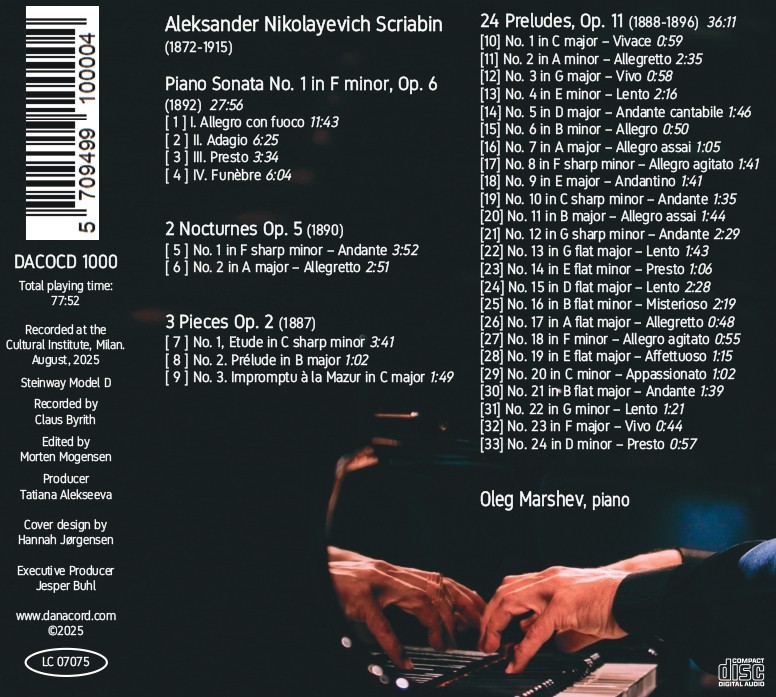 Gramophone ha considerato il primo album di Prokofiev di Oleg Marshev per Danacord (DACOCD391) come "una delle più autorevoli e appassionate esecuzioni [della Prima Sonata] su disco finora". La sua interpretazione della trilogia delle Sonate "di guerra" è stata premiata con il "Classic CD Choice" e confrontata con i pilastri della musica per grammofono come Richter, Berman e Ashkenazy. Nato a Baku, in Azerbaigian, Oleg Marshev si è formato con Valentina Aristova alla Gnessin State Musical College e con Mikhail Voskresensky al Conservatorio di Mosca. È annoverato tra la quinta generazione del pianismo russo dopo Liszt, attraverso la stirpe di Alexander Siloti, Konstantin Igumnov e del maestro di Voskresensky, Lev Oborin. Residente in Italia dal 1991, Marshev ha ricevuto riconoscimenti in diversi concorsi pianistici internazionali in Canada, Italia, Portogallo, Spagna e Stati Uniti, tra cui quattro primi premi. Oggi è ampiamente riconosciuto come uno dei pianisti russi di maggior talento della sua generazione.