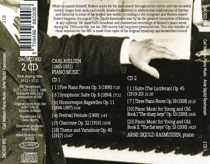 Pur non essendo un pianista, Nielsen scrisse per lo strumento per tutta la sua carriera, e questa rassegna registrata spazia dalle prime miniature vivacemente dettagliate alle avventurose esplorazioni del ritmo e dell'armonia in alcuni dei suoi lavori tardivi più audaci. Secondo il compositore ed esperto di Nielsen Robert Simpson, il pianista Arne Skjold Rasmussen è stato "di gran lunga il più grande interprete di Nielsen in qualsiasi mezzo". Ha effettuato registrazioni sia radiofoniche che commerciali di Nielsen durante gli anni Cinquanta e Sessanta, ma la sua indagine del 1960 era stata a lungo ritenuta perduta. Questo nuovo trasferimento di quelle sessioni per la BBC è realizzato a partire dai nastri della trasmissione originale, con un suono eccellente per l'epoca.
