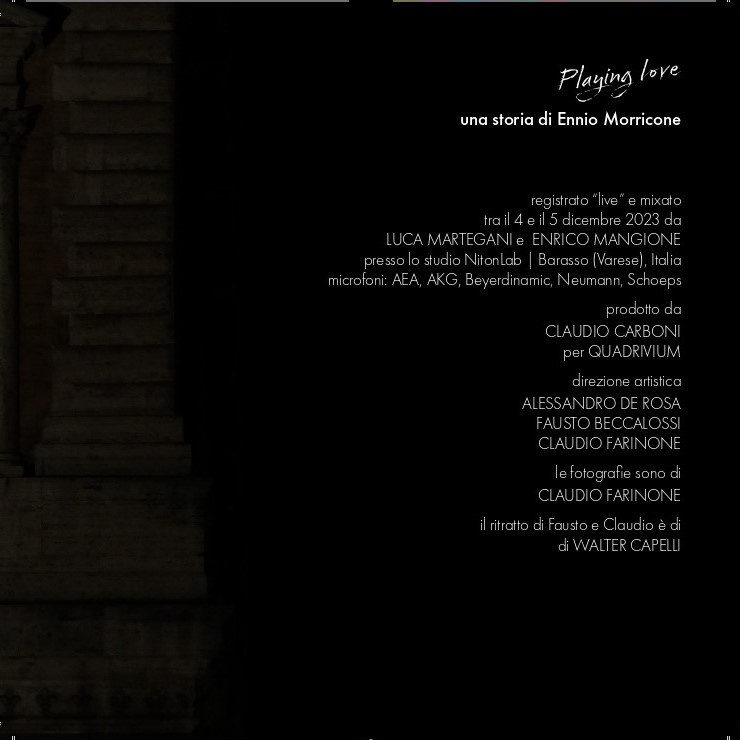 Spesso considerata come elemento di semplice abbellimento, la musica per il cinema rischia di ricoprire un ruolo di secondo piano all’interno della produzione filmica. Ennio Morricone è stato invece il compositore che ha reso la musica l’elemento protagonista, conferendole autorevolezza. Una esperienza professionale e di vita ricca e a tratti ancora misteriosa che lo ha portato ad interagire con tutti i contesti che il XX secolo potesse offrire ad un musicista. Raccontare e reinterpretare Ennio Morricone non significa solamente rapportarsi con il suo fecondo e straordinario rapporto col cinema, ma può spalancare ampie riflessioni sulla musica, sulla società e la cultura del suo e del nostro presente. Discutere la modernità, l’oggi. Un importante percorso per assumere prospettiva ed orientarsi anche attraverso il percorso formativo, artistico e di vita di questo Maestro conosciuto in tutto il mondo, ripercorrendo alcune delle sue intramontabili pagine musicali. "PLAYING LOVE" è la realizzazione su disco del progetto “Inseguendo quel suono”, uon spettacolo di narrazione e musica che vede protagonisti Alessandro De Rosa, il biografo ufficiale di Ennio Morricone e autore dell’omonimo libro, pubblicato per