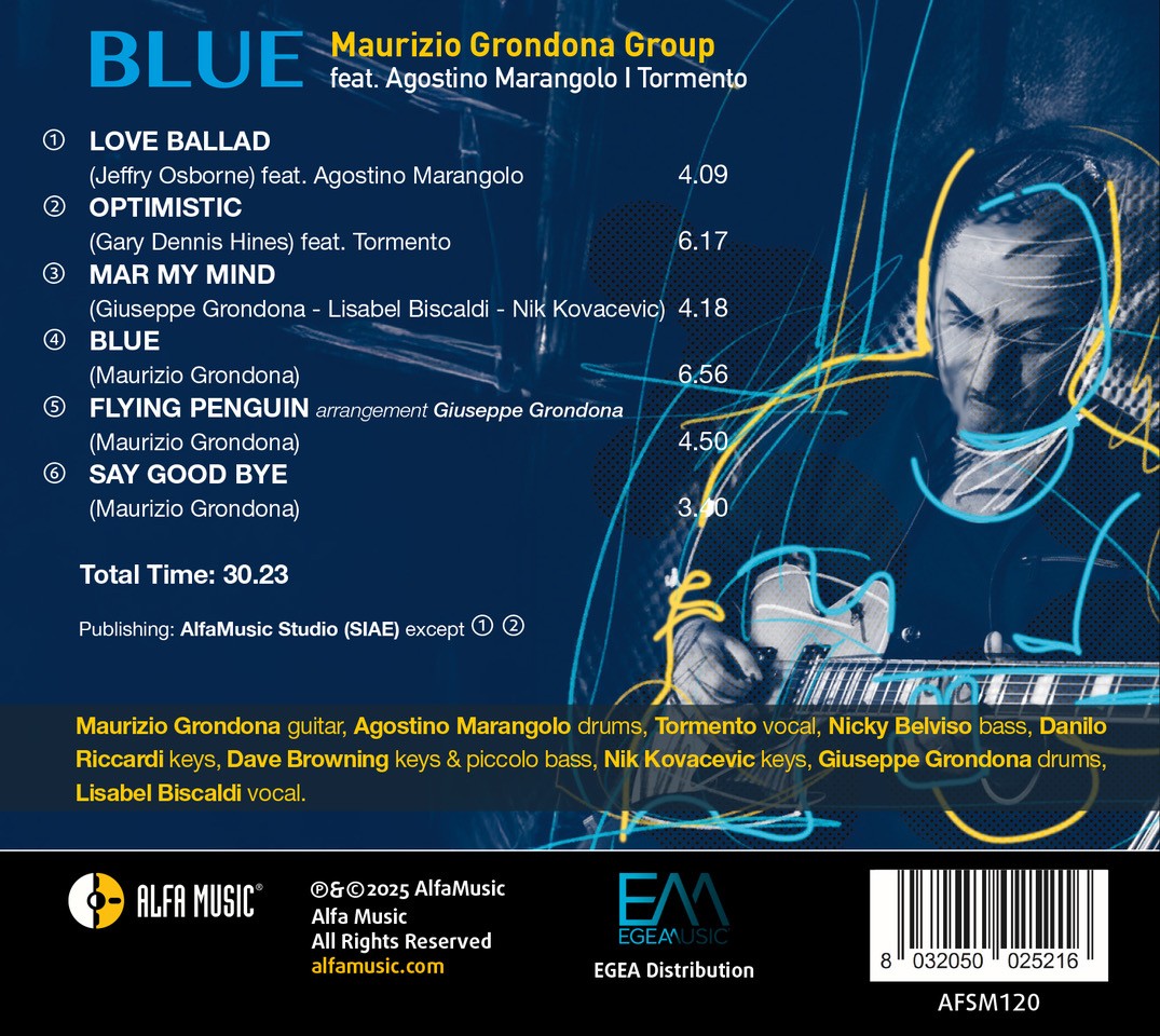 Una delle prime cose che potreste notare ascoltando i brani di questo nuovo album del Maurizio Grondona Group è l‘approccio altamente sofisticato allo “strumento” chitarra. A differenza di molti altri virtuosi dello strumento, Grondona sa come mantenere il giusto equilibrio nella sua produzione. Non eccede mai nelle esecuzioni delle parti di chitarra e sembra che ogni nota sia esattamente dove dovrebbe essere. Ciò in realtà è cosa non semplice da realizzare in quanto potremmo affermare che suonare su questi brani è ingannevolmente facile poiché se ascolti davvero attentamente e consideri la chitarra nel contesto di ogni brano, è allora che finalmente inizi a capire quanto sia sorprendente la musica che suona e quanto sia ricca la chitarra di Grondona. L‘album crea un ponte tra influenze jazz classiche e idee moderne, offrendo una esperienza d‘ascolto fluida egratificante. Che tu sia un fan sfegatato del jazz o un nuovo arrivato in questo meraviglioso genere, dovresti ascoltare questo disco perché ne vale sicuramente la pena. Grondona conduce il suo BLUE rendendo omaggio ai più grandi musicisti jazz, continuando la loro tradizione ed eredità e contemporaneamente offre elementi interessanti di sobria contemporaneità. - JazzCorner - USA