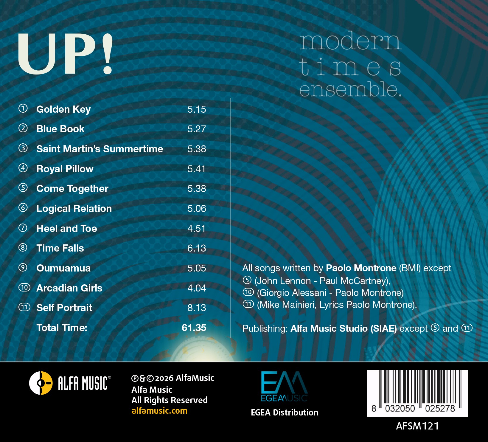 UP! è il nuovo album del Modern Times Ensemble, collettivo jazz-fusion internazionale guidato dal chitarrista, compositore e produttore Paolo Montrone. Dopo l'album d'esordio Connections (AlfaMusic, 2022), accolto con interesse da critica e pubblico in Europa, Giappone e Americhe, UP! rappresenta un deciso passo avanti, ampliando il linguaggio musicale, la scrittura e la visione produttiva del progetto. L’album vede la partecipazione di guest artist di primo piano della scena internazionale, coinvolti per arricchire ulteriormente la tavolozza sonora dell’ensemble. Tra questi figurano Mike Mainieri, fondatore degli Steps Ahead, Allen Hinds, Travis Carlton, Donald Barrett, Matt Rohde, il produttore Jimmy Bralower e il sassofonista Paul Booth. Completano il quadro il cantante Giorgio Alessani, che apporta una forte componente espressiva e narrativa, e il sassofonista Mimmo Malandra, il cui contributo unisce linguaggio jazz e suggestioni cinematografiche. Il cuore del progetto è rappresentato dalla formazione del Modern Times Ensemble, un gruppo di musicisti con un’identità sonora ben definita e una lunga esperienza internazionale: Paolo Montrone – chitarre elettriche e acustiche, melodica; compositore, arrangiatore, produttore, Ursula Gerstbach – voce solista, arrangiamenti vocali, Arcangelo Trabucco – tastiere, Adam Alesi – batteria, Itaiguara Brandão – basso, C.J. Rhen – fiati, Drew Herter – trombone, Tito Planas – trombone.