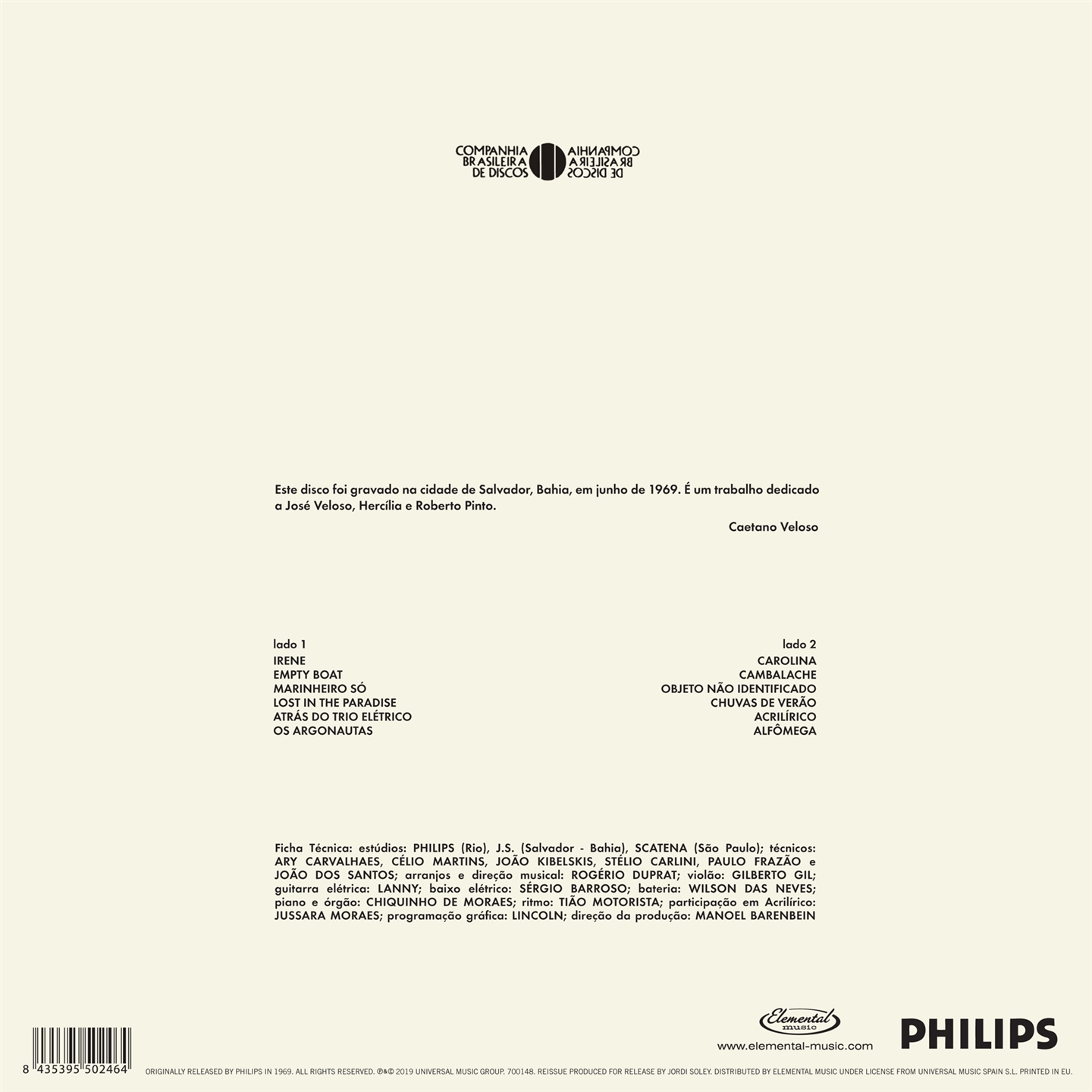 Elemental Music, in collaborazione con Universal Music, presenta in occasione del cinquantesimo anniversario dalla pubblicazione originale la ristampa del terzo album di Caetano Veloso. Conosciuto anche come “Irene” o “Album Branco”, questo capolavoro da tempo non più disponibile è considerato uno dei più grandi album brasiliani di sempre. Le tracce di voce e chitarra acustica sono state registrate in un piccolo studio a Salvador de Bahia, dove Veloso era stato confinato per aver sfidato il governo brasiliano dell'epoca. Le tracce sono state poi inviate all'arrangiatore e produttore Rogério Duprat, che ha aggiunto chitarre elettriche, fiati, basso, batteria e altri strumenti in uno studio più professionale a San Paolo. L’album è molto eclettico, con canzoni che vanno dalla bossa nova al rock psichedelico, dalla musica tradizionale bahiana al fado e al tango. L'album contiene brani in portoghese, spagnolo e inglese.