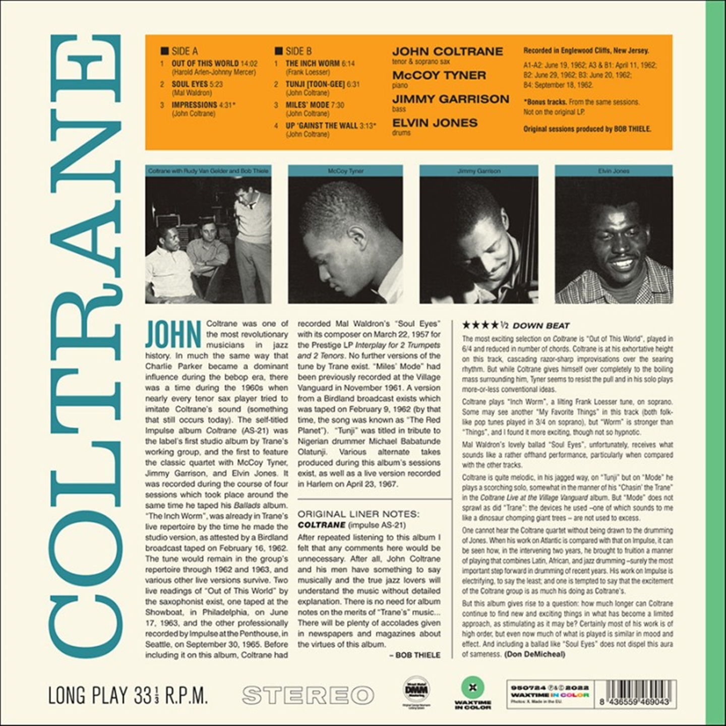 John Coltrane è stato uno dei più importanti musicisti della storia del jazz. Questo Lp ripropone uno dei suoi album più rappresentativi: l’omonimo “Coltrane”. Il disco, registrato nel 1962, rappresenta il primo album del sassofonista per l’etichetta Impulse e anche il primo con il suo classico quartetto formato da McCoy Tyner al piano, Jimmy Garrison al contrabbasso e Elvin Jones alla batteria. Come bonus di questa nuova edizione sono stati aggiunti i brani "Impressions" e “Up ‘Gainst The Wall” registrati nel corso della stessa sessione, ma non inclusi nell’ Lp originale.