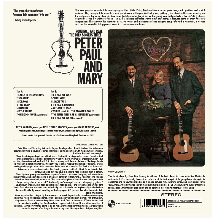 Il gruppo di musica folk acustica più popolare degli anni Sessanta, Peter, Paul e Mary hanno mescolato grandi canzoni con l'attivismo politico e sociale. Hanno portato musica folk a un nuovo protagonismo nell'era post-McCarthy, mettendo alla radio testi che parlano di politica e moralità , in mezzo alle sciroppose melodie d'amore tra ragazzo e ragazza che dominavano l'etere. Qui viene presentato nella sua interezza il primo album del trio, pubblicato originariamente nel 1962, la splendid autoproduzione di Peter, Paul and Mary. Il disco contiene alcune delle loro belle composizioni come "Early in the Morning" o "Cruel War", e ottime interpretazioni di "500 Miles" di Hedy West e della canzone di Pete Seeger "If I Had a Hammer".