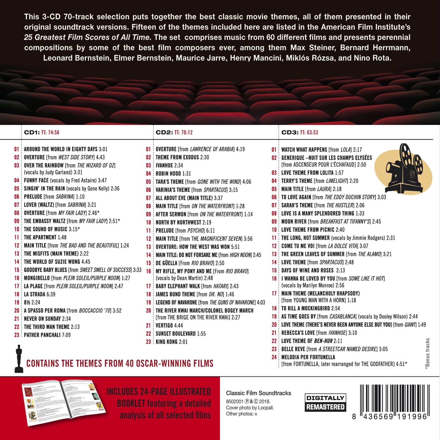 Questo triplo cd riunisce 70 grandi temi da film, tutti presentati nelle loro versioni originali tratte dalle rispettive colonne sonore. La selezione comprende musica di ben 60 film diversi e include i lavori di alcuni dei migliori compositori di colonne sonore tra cui Max Steiner, Bernard Herrmann, Leonard Bernstein, Elmer Bernstein, Maurice Jarre, Henry Mancini, Miklós Rózsa e Nino Rota.